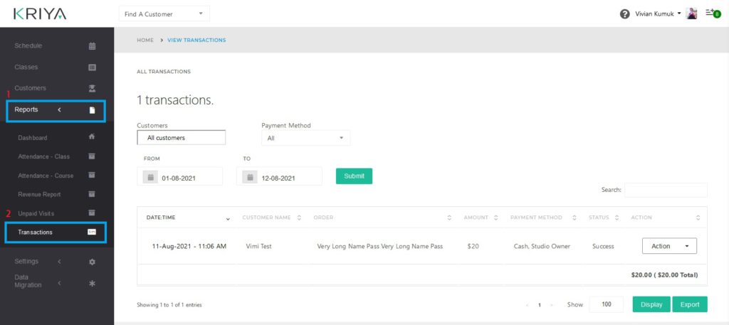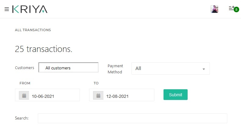 KRIYA Booking System has a Transactions Report feature to quickly view transactions made at your business. The report provides options like viewing, receipt and creating Invoices.