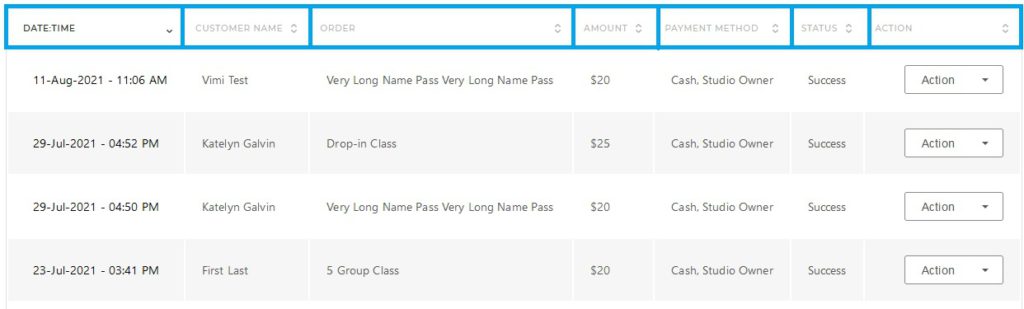 Example: If I want to see all the transactions made for a particular pass, like Hatha Yoga Advance Course. I will type “Hatha Yoga Advance Course” in the search box.