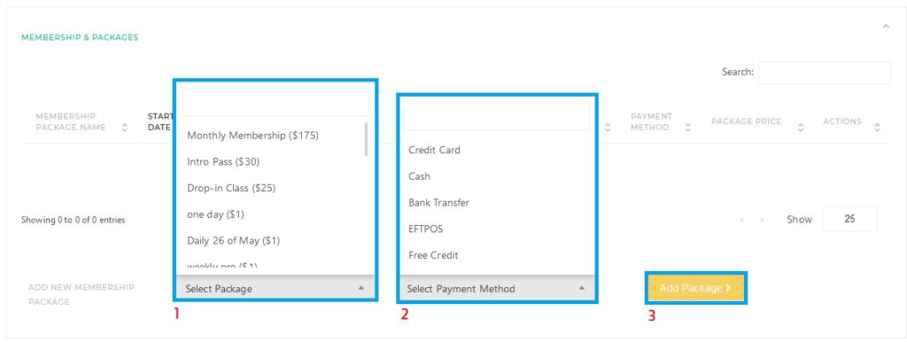 Once you are on the Customer’s Details Page using the Navigation steps, scroll down and look for the—Membership & Packages—section. In it, find the Add New Membership Package Row.