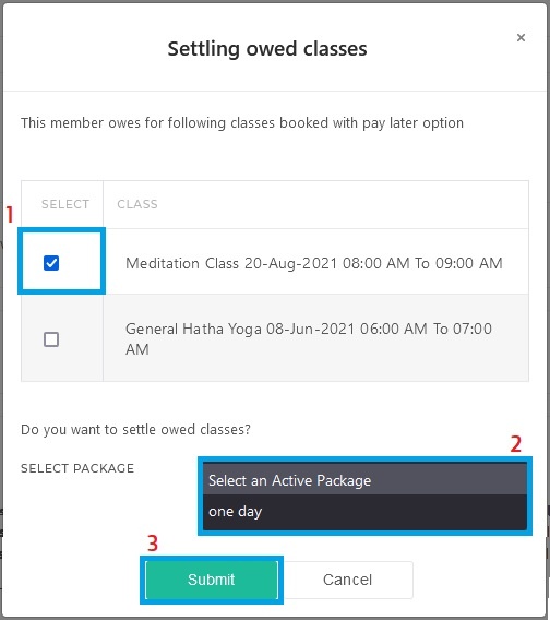 - A Settling owed classes Pop-Up will appear. Select the number of Classes using the Check Boxes.