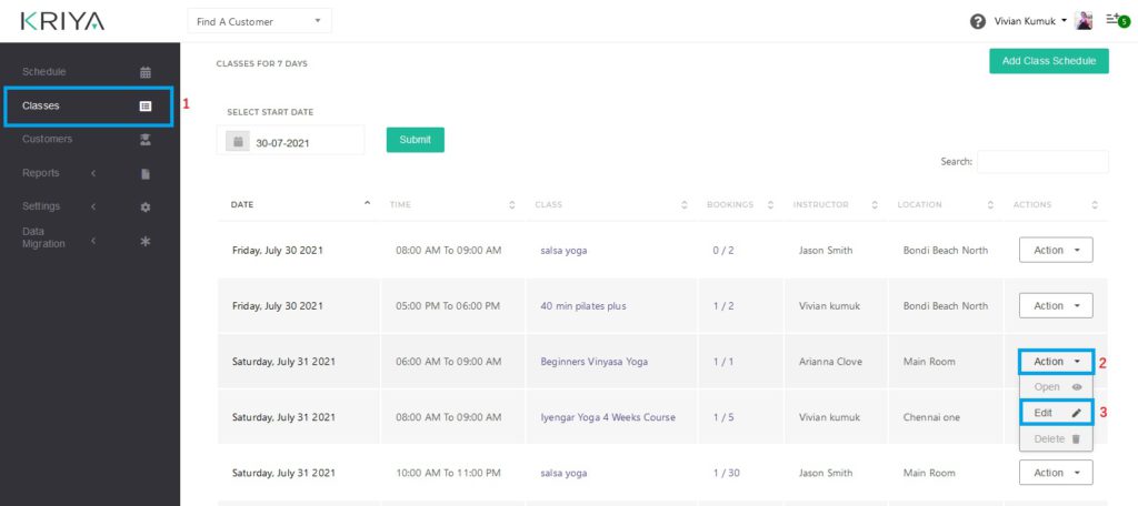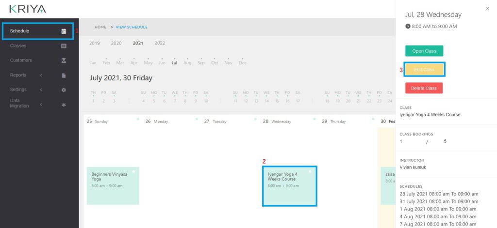 - To reach the class you want to edit, click Schedule on the left main menu.