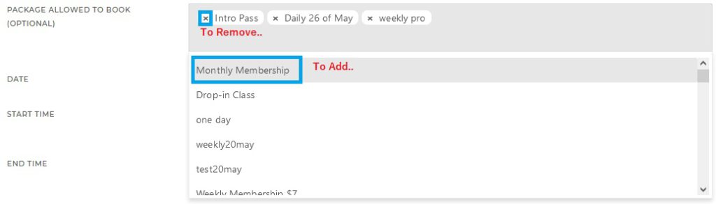 After Reaching the Edit Class Schedule Page. Look for Package allowed to book (Optional) Option.