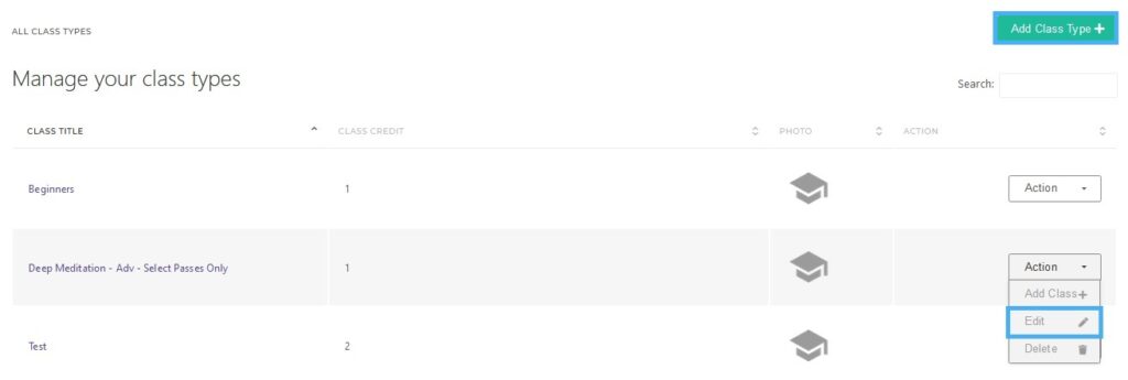 Click on—the Actions—Button, then Edit to edit an existing Class Type.
